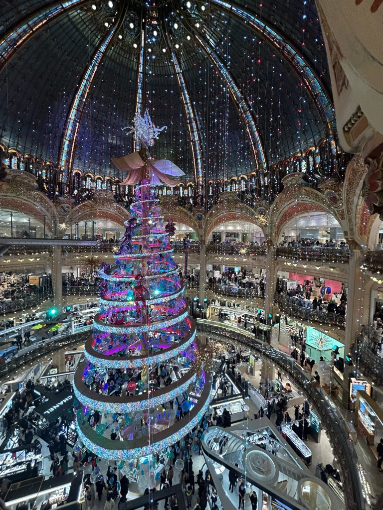 I hope you have your walking shoes on, and maybe even your snow boots, because we went to Les Galeries Lafayette Haussmann to see this year’s decorative theme, and it did not disappoint. The place is quite crowded due to the decorations and the small bridge where people line up around the corner to take photos. However, you can enjoy a coffee like we did at the café upstairs, and take as many pictures as you like. We plan to come back here throughout our trip.